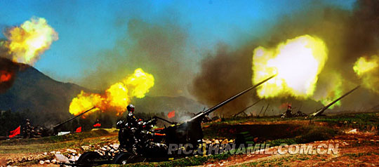 转瞬间,翘首待命的高炮、导弹齐声恕吼,一发发炮弹像长了眼睛直刺靶标,空中炸开一团团耀眼的火花……