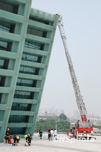 9月3日上午,重庆市消防部门水陆多警种协同配合,出动300名消防官兵和35辆包括陆上和水上的消防车辆和战艇,在建成不久的重庆大剧院举行消防灭火救援演练。图为消防人员利用消防云梯到建筑物高层救人。中新社发 胡虹 摄