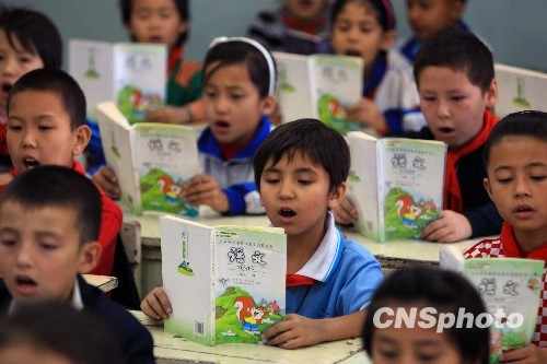 图为9月3日,新疆乌鲁木齐第39小学三年级维吾尔族学生正在朗读中文语文课文。中新社发 刘新 摄