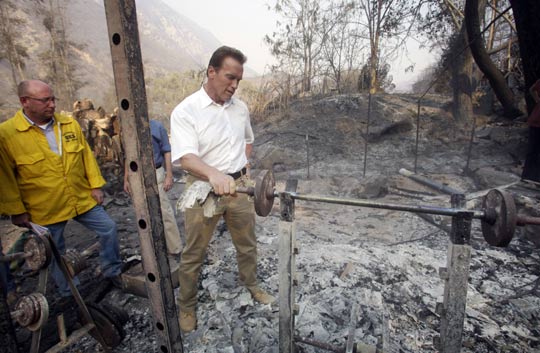 当地时间9月3日,加州州长施瓦辛格探访了洛杉矶市图洪加附近被火灾烧毁的地区。图为施瓦辛格握着从废墟里找到的烧黑了的哑铃。