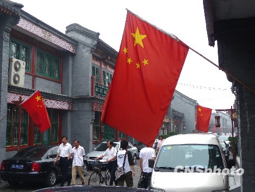 9月4日,北京宣武区大栅栏及琉璃厂地区,胡同两侧迎风飘扬的五星红旗与大红灯笼交相辉映,洋溢出浓郁的节日喜庆气氛,迎接新中国60周年国庆的到来。据悉,此次宣武区大栅栏及琉璃厂地区发放了600面国旗,预计今年国庆前,将会有3000面崭新的国旗在宣武各胡同飘扬。中新社发 玉龙 摄