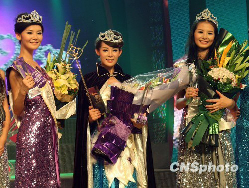 图为来自湖南郴州的20岁女孩李叶青(中)笑到最后,一举夺得本届星姐总冠军,山东女孩杨子祯(左)和湘妹子谭亚琴分获第一亚军和第二亚军称号。