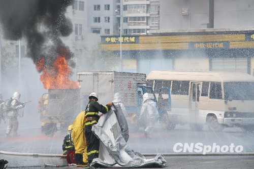 图为消防武警战士在进行处置危险化学品突发事故演练。中新社发 周利朔 摄