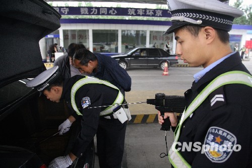 图为警察动用“搜爆仪”排查所有车辆。中新社发 翟羽佳 摄