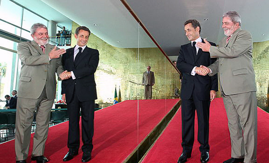 图为巴西总统卢拉(右)与法国总统萨科齐在签字仪式前握手。