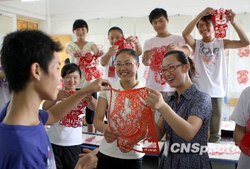 9月7日,安徽省淮北市特殊教育学校的孩子们将自己制作的剪纸送给老师。教师节临近,安徽省淮北市特殊教育学校的孩子亲手剪纸为老师献上教师节的祝福。中新社发 王璋闻 摄