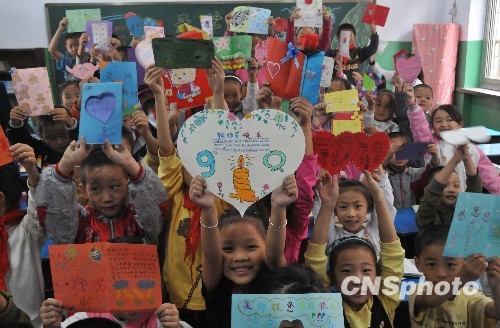 9月8日,河南洛阳市老城区坛角小学的学生展示自己制作的精美贺卡。教师节临近,老城区坛角小学的学生们制作了各种贺卡献给老师,表达对老师们的节日祝福。中新社发 赵朝军 摄