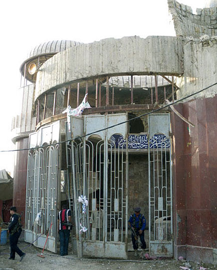 警察在发生炸弹爆炸事故的清真寺现场警戒。