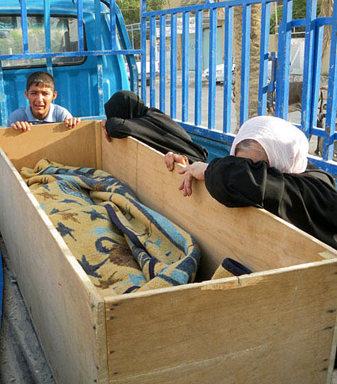 一名清真寺爆炸事件遇难者的亲属在其遗体旁哭泣。