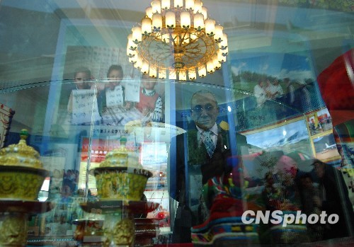 一名参观者被北京民族文化宫举行的西藏成果展中的珍奇展品吸引。中新社发 侯宇 摄