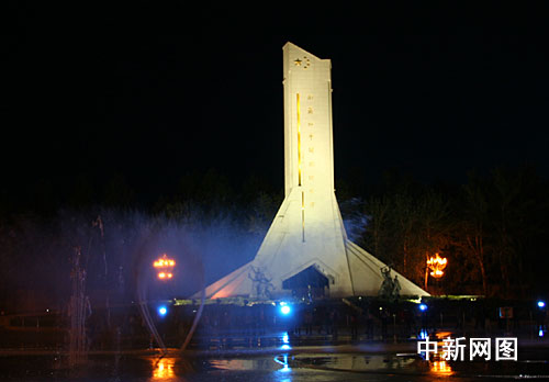 布达拉宫广场上的西藏和平解放纪念碑。音乐喷泉奏响着《走进新时代》,响彻整个广场。