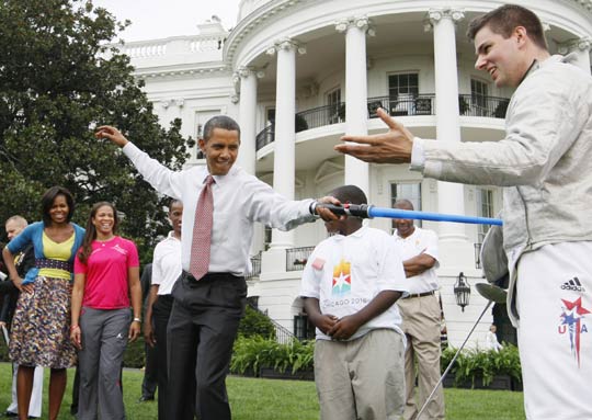 9月16日,美国华盛顿白宫南草坪举行一场以支持芝加哥申办2016年夏季奥运会为主题的奥运体育项目展示活动,总统奥巴马及第一夫人米歇尔·奥巴马出席活动。图为奥巴马总统在白宫南草坪展示“剑法”。