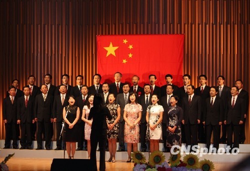 图为晚会上,驻日大使崔天凯带领使馆工作人员为晚会献上一曲《中国中国鲜红的太阳永不落》。中新社发 关妍 摄