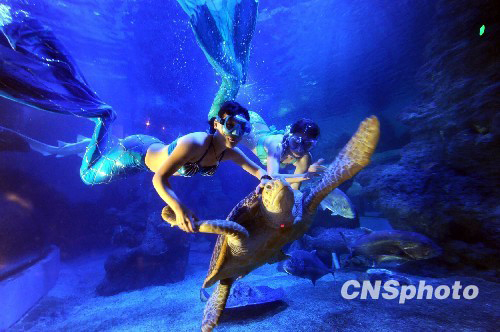 在福州左海海底世界里,婀娜多姿的“美人鱼”不带任何供氧设备,潜入5米深的 “海底”与海龟携手漫步,吸引游客目光。中新社发 杨婀娜 摄