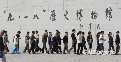 9月18日,在沈阳“九·一八”历史博物馆,社会各界人士自发前来参观,表达珍爱和平、振兴中华的共同心愿。中新社发 罗澜 摄