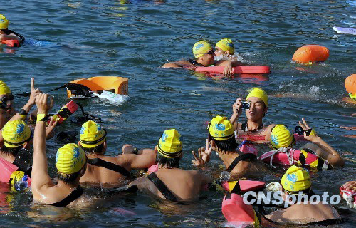 9月20日上午7时,第27届日月潭万人泳渡嘉年华活动在台湾朝雾码头鸣枪,2.58万多名游泳爱好者畅游在日月潭中,尽情享受宝岛台湾的秀美风光。来自大陆黑龙江、江苏、温州、石狮等代表队近3000名游客组队参加,使之成为迄今为止海峡两岸规模最大的一次民间体育交流盛事。中新社发 杨婀娜 摄