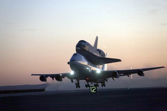 当地时间9月20日,一架改装的波音747客机搭载着“发现”号航天飞机从美国加利福尼亚州爱德华兹空军基地起飞。美国宇航局预计“发现”号将在21日抵达位于佛罗里达州的肯尼迪航天中心。