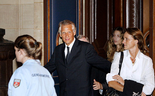 图为法国前总理德维尔潘(中)和妻子玛丽洛尔(右一)离开法院。