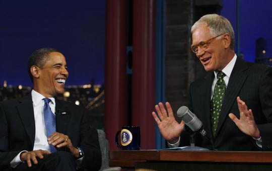 当地时间9月21日,美国纽约,美国总统奥巴马参加CBS电视台著名脱口秀节目《大卫·莱特曼深夜秀》的录制。