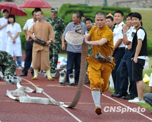 9月22日,浙江舟山市普陀山风景名胜区管理委员会举办“首届普陀山消防运动会”,全山各企事业单位、普陀山佛教协会的169名运动员组成12支队伍,参加了一人两盘水带连接、原地着装、油桶灭火等5个项目的比赛。中新社发 琳红 摄