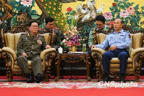 9月22日,中国人民解放军副总参谋长马晓天上将(右)在北京会见由朝鲜人民武装力量部副部长朴在京大将率领的朝鲜军事代表团一行。中新社发 富田 摄