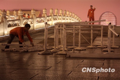 北京天安门金水桥护栏拆除。中新社发 吴芒子 摄