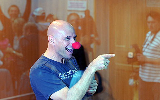 9月27日,加拿大首名太空旅客:前杂技演员拉利伯特戴着小丑鼻子,在哈萨克斯坦拜科努尔发射场与前来看望他的朋友们挥手致意。