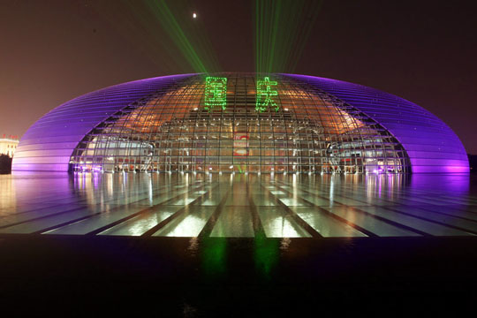 9月28日,国家大剧院周围景观灯悉数开启,时而出现“60”,时而出现“国庆”字样。
