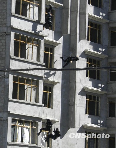 图为特警正对藏匿于建筑物二楼的“犯罪分子”发起总攻击。中新社发 徐长安 摄
