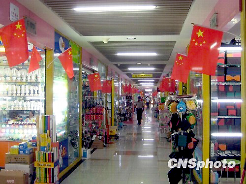 在国庆来临之际,浙江义乌国际商贸城换上“国庆装”,每家商铺门口都挂上了五星红旗。不同的商家都选择同样的方式来庆祝祖国六十周年华诞。中新社发 朱丽珍 摄