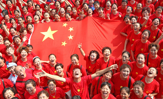 9月29日,重庆市南岸区洋人街,人们举着国旗开怀大笑。当日,“万人大笑迎国庆”活动在洋人街举行,上万群众身穿代表祖国颜色的红衣高举国旗在洋人街游行并举行各式各样的歌舞表演。