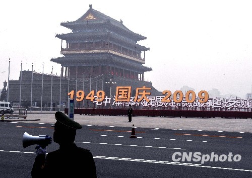 北京天安门广场9月30日进行国庆六十周年庆典的最后准备,许多巨型标语牌整齐摆放在正阳门前。中新社发 贾国荣 摄
