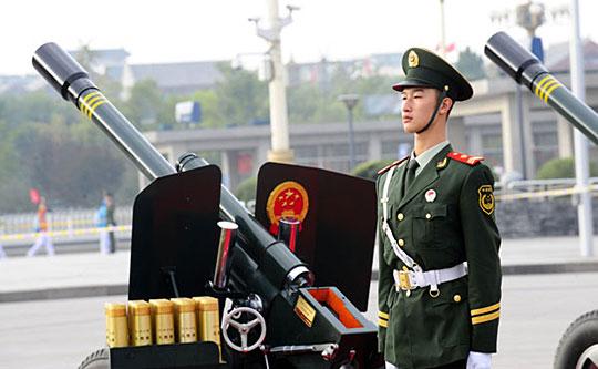 首都各界庆祝中华人民共和国成立60周年大会将于10月1日10时在北京举行。这是国庆礼炮阵地准备就绪,静候庆典开始。