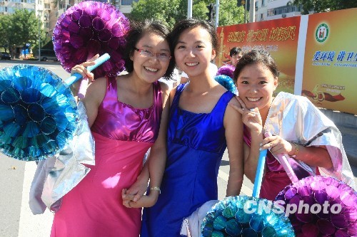 三位女孩参加完群众游行后合影留念。中新社发 汤彦俊 摄