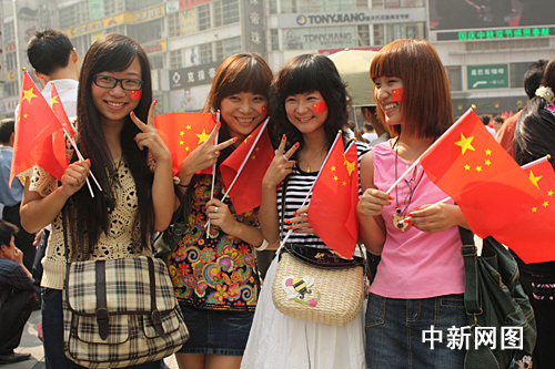 4名重庆美眉脸贴国旗、手拿国旗在山城街头共同庆祝祖国60华诞。 曾垂平 摄