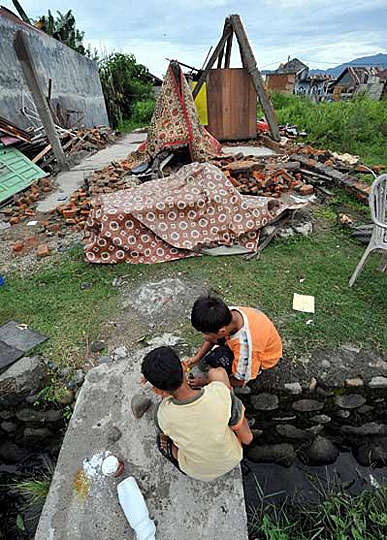 在印度尼西亚西苏门答腊省巴东市,两名儿童在地震废墟旁玩耍。