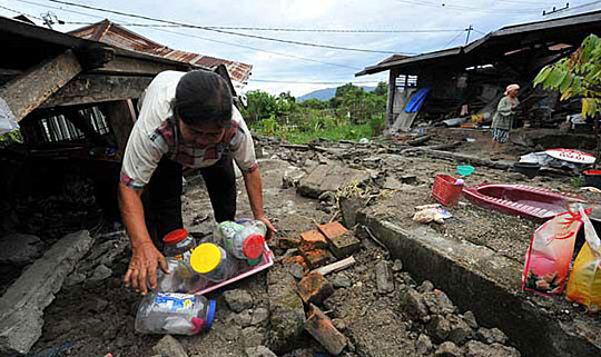 在印度尼西亚西苏门答腊省巴东市,居民在地震废墟上收拾。