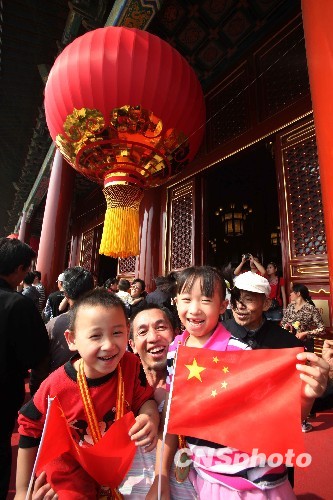北京天安门城楼迎来大批游客。中新社发 陈晓根 摄