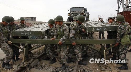 济南军区某装甲师进行铁路装卸载训练。中新社发 毕华明 摄