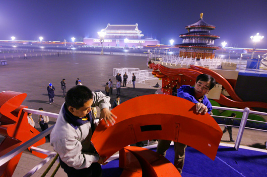 2009年10月11日晚,北京天安门广场,许多游人为了能和国庆彩车再多拍一张照片留念依依不舍。晚10点左右,所有彩车陆续熄灯,并开始拆卸。于12日凌晨左右已拆卸的国庆彩车驶离天安门广场。 王钰谊 摄