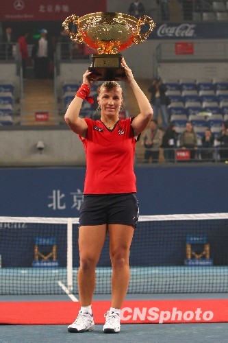 实力占优的库兹涅佐娃仅耗时79分钟,就直落两盘以6-2/6-4轻取对手,自2006年之后第二次捧起中网女单冠军,她也是中网历史上第一位两夺冠军的选手。中新社发 富田 摄