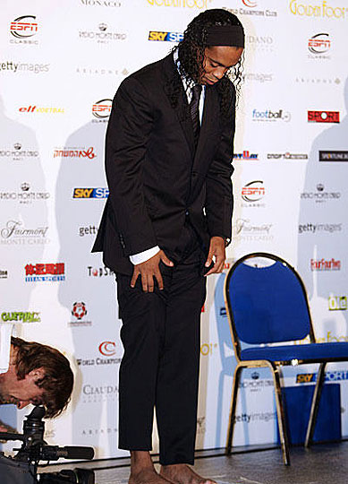 罗纳尔迪尼奥在颁奖仪式上留下脚模。