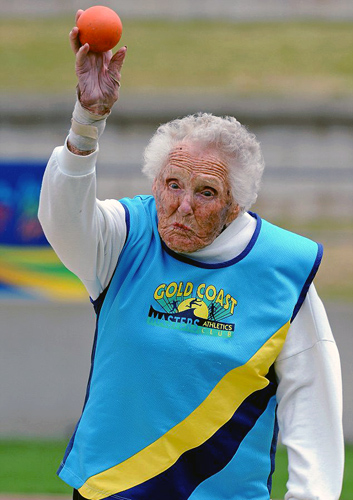 2009年度世界大师锦标赛日前在澳大利亚的悉尼举行,多位头发花白的老者也报名参赛。令人称奇的是,一位百岁老太太竟然一路过关斩将,获得铅球比赛的冠军。