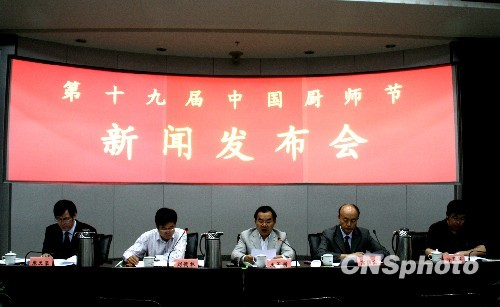 10月13日,扬州政府举行第十九届中国厨师节新闻发布会,扬州副市长王玉新(中)、中国烹饪协会副会长高炳义(右二)、扬州市政府副秘书长刘德林(左二)、扬州市委宣传部副部长叶冠军(右一)以及扬子江集团董事长朱元豪出席。由中国烹饪协会和扬州市政府主办,扬子江集团承办第十九届中国厨师节即将于2009年10月17日—20日在扬州举办。本届厨师节以“烹绿色餐饮,享健康人生”为活动主题,突出绿色餐饮、精致餐饮,弘扬中华餐饮文化;以节为媒,加强餐饮界同仁的交流,提升餐饮业社会影响力,同时展示“中国淮扬菜之乡”的风韵,凸显扬州在中国四大菜系之一淮扬菜的霸主地位。期间将举行第二届高等学校烹饪技能大赛暨首届全国高校餐旅类专业创业大赛;首届中国市长餐饮发展论坛;2009年中国餐饮业博览会暨中国(扬州)国际餐饮业供应与采购博览会等15项主要活动。中新社发 崔佳明 摄