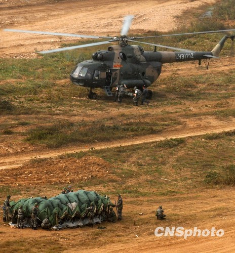 10月13日,代号“前锋—二00九”的基本战役军团联合训练试验论证活动实兵实弹演习,在济南军区确山某合同战术训练基地进行陆空联合火力打击实兵交战演练后结束。这次演习首次检验论证了解放军基本战役军团构建联合作战指挥机构、运行机制、作战样式、保障模式等内容。图为直升机抢运伤员。中新社发 李亮 摄