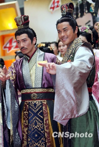 香港无线电视为庆祝42周年台庆,推出大型古装剧《宫心计》。十八日,领衔主演的陈豪(左)、郑嘉颖展示唐代华丽的宫廷服装,向观众介绍深宫后院内勾心斗角的剧情。中新社发 洪少葵 摄