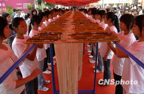 10月18日,在“中国过桥米线之乡”云南省蒙自县,成功做出一根长度为2567.8米的米线。据介绍,该米线制作采用蒙自传统的米线制作工艺,历时6小时07分,共使用大米1.8吨。最后,经上海吉尼斯总部认证,该米线长度为中国第一长。图为上百人参与制作该根米线。中新社发 保旭 摄