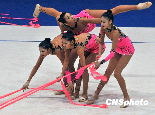 辽宁队在第十一届全运会山东德州赛区艺术体操团体总分决赛技压群芳,夺得金牌。中新社发 贾国荣 摄
