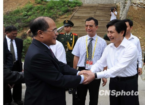 在友谊关零公里处,他受到中国崇左市市委书记崔智友(右)等当地官员的热烈欢迎。中新社发 蒋雪林 摄