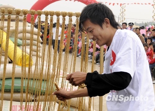 山东省枣庄市山亭区城头镇举行农民趣味大闯关运动会,来自全镇21个行政村和60多家豆制品生产加工企业的180多名农民选手参加比赛。中新社发 李宗宪 摄